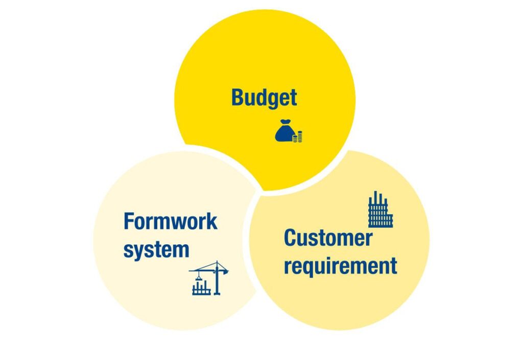 The building’s footprint and its development as it gains height are unique to every project. These geometric boundary conditions such as changes in wall cross-section or inclination and the resulting complexity, as well as the number of storeys, are crucial for selection of the right formwork systems.